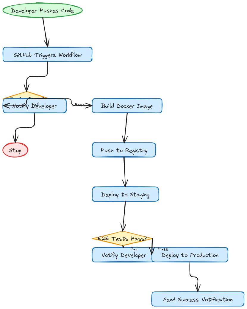 Create a flowchart showing a CI/CD pipeline: Developer pushes code -> GitHub triggers workflow -> Run Tests (decision: pass/fail) -> if fail, notify developer and stop -> if pass, Build Docker Image -> Push to Registry -> Deploy to Staging -> Run E2E Tests (decision) -> if pass, Deploy to Production -> Send success notification. Save as 'cicd_pipeline.excalidraw'.