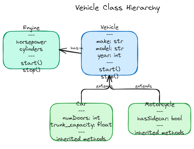 Create a UML class diagram showing: Vehicle (base class with properties: make, model, year and methods: start(), stop()) -> Car (extends Vehicle, adds: numDoors, trunk_capacity) and Motorcycle (extends Vehicle, adds: hasSidecar). Also show an Engine class that Vehicle has-a relationship with. Save as 'class_diagram.excalidraw'.