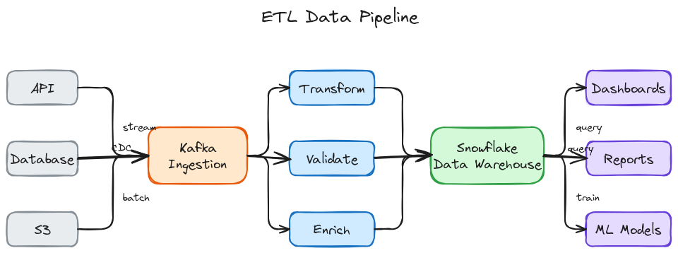 Create a data flow diagram showing an ETL pipeline: Data Sources (API, Database, S3) -> Ingestion Layer (Kafka) -> Processing (Spark jobs for Transform, Validate, Enrich) -> Data Warehouse (Snowflake) -> Analytics (Dashboards, Reports, ML Models). Use different colors for each stage. Save as 'data_flow.excalidraw'.