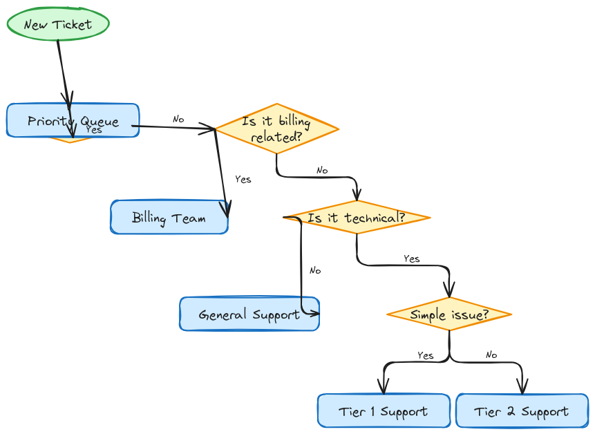 Create a decision tree flowchart for support ticket routing: New Ticket -> Is it urgent? (Yes: Priority Queue) -> Is it billing related? (Yes: Billing Team, No: next check) -> Is it technical? (Yes: check complexity) -> Simple issue? (Yes: Tier 1 Support, No: Tier 2 Support) -> Default: General Support. Use diamond shapes for decisions. Save as 'decision_tree.excalidraw'.