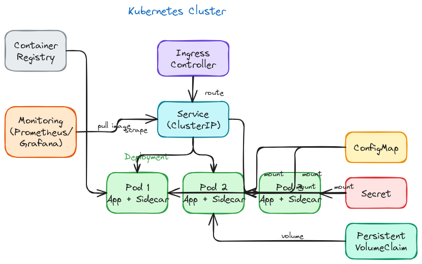 Create a deployment architecture diagram: Kubernetes Cluster containing: Ingress Controller -> Service (ClusterIP) -> Deployment with 3 Pod replicas -> each Pod has App Container and Sidecar. Show ConfigMap and Secret connecting to Pods. Show PersistentVolumeClaim connecting to Pods. External: Container Registry and Monitoring (Prometheus/Grafana). Save as 'deployment.excalidraw'.