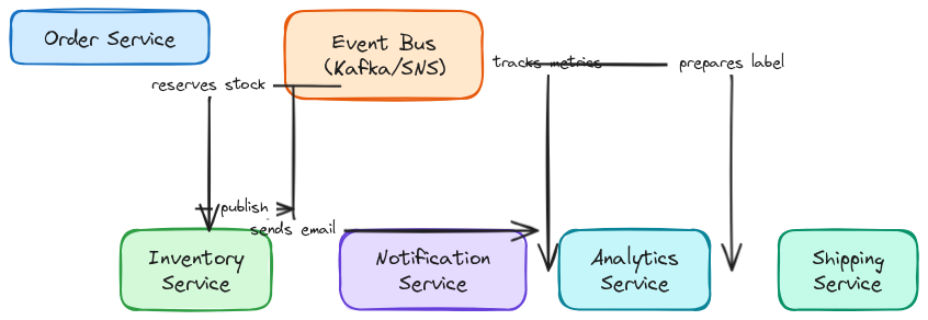 Create an architecture diagram for event-driven system: Order Service publishes OrderCreated event -> Event Bus (Kafka/SNS) -> multiple consumers: Inventory Service (reserves stock), Notification Service (sends email), Analytics Service (tracks metrics), Shipping Service (prepares label). Show the event flow with arrows. Save as 'event_driven.excalidraw'.