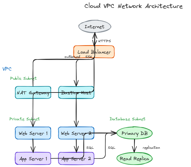 Create a network architecture diagram showing: Internet -> Load Balancer -> Public Subnet (with NAT Gateway and Bastion Host) -> Private Subnet (with Web Servers and App Servers) -> Database Subnet (with Primary DB and Read Replica). Show the VPC boundary and subnet boundaries. Save as 'network_topology.excalidraw'.