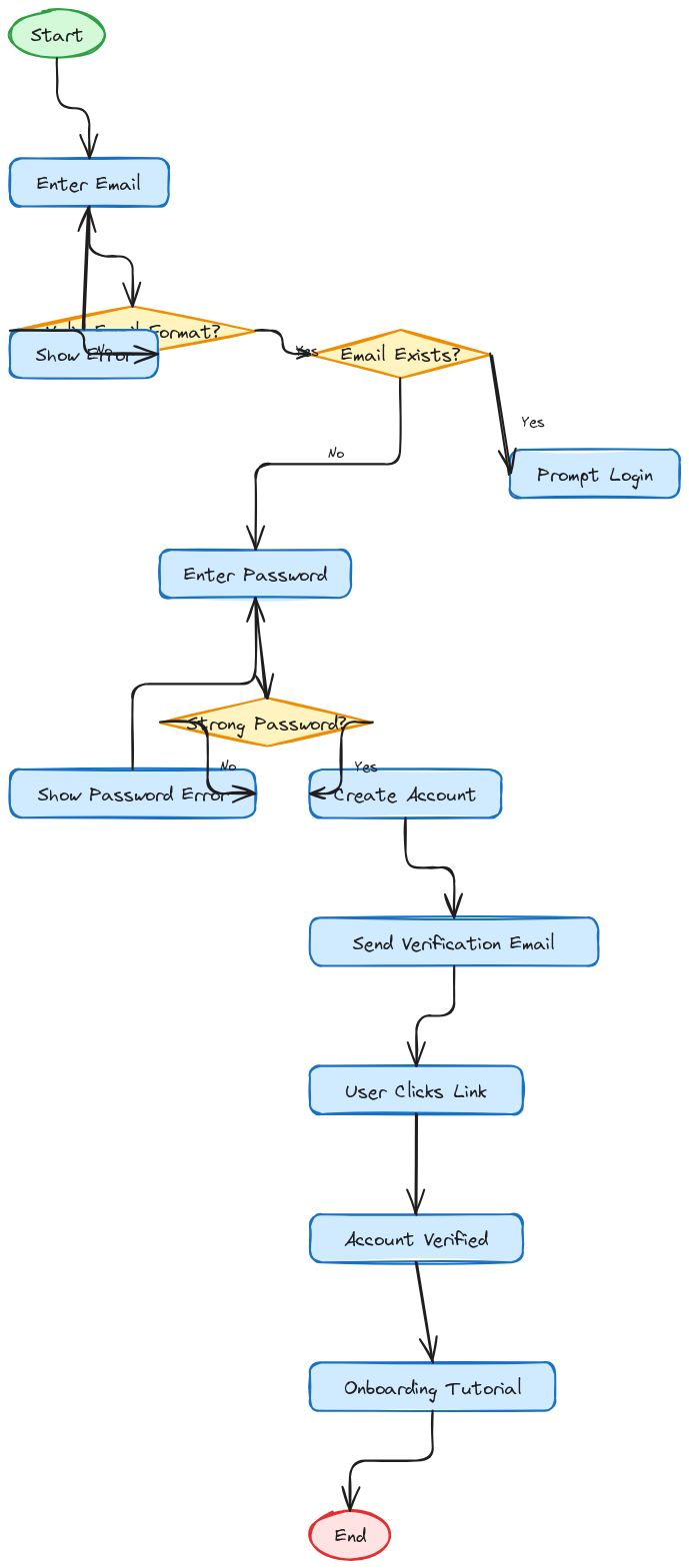 Create a flowchart for user registration: Start -> Enter Email -> Validate Email Format (decision) -> if invalid, show error and loop back -> Check if Email Exists (decision) -> if exists, prompt login -> Enter Password -> Validate Password Strength -> Create Account -> Send Verification Email -> User Clicks Link -> Account Verified -> Onboarding Tutorial -> End. Save as 'user_journey.excalidraw'.